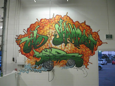 As mentioned in earlier posts, the murals at the Sharpest Rides are steadily progressing. This mural was completed at the beginning of August. Here are some process photos of the one day project on the interior of the mechanics shop. The entire process took 9 hours, with a few hours to layer the sketch and refine it. Final photographs to come. Also more murals to come from TSR.