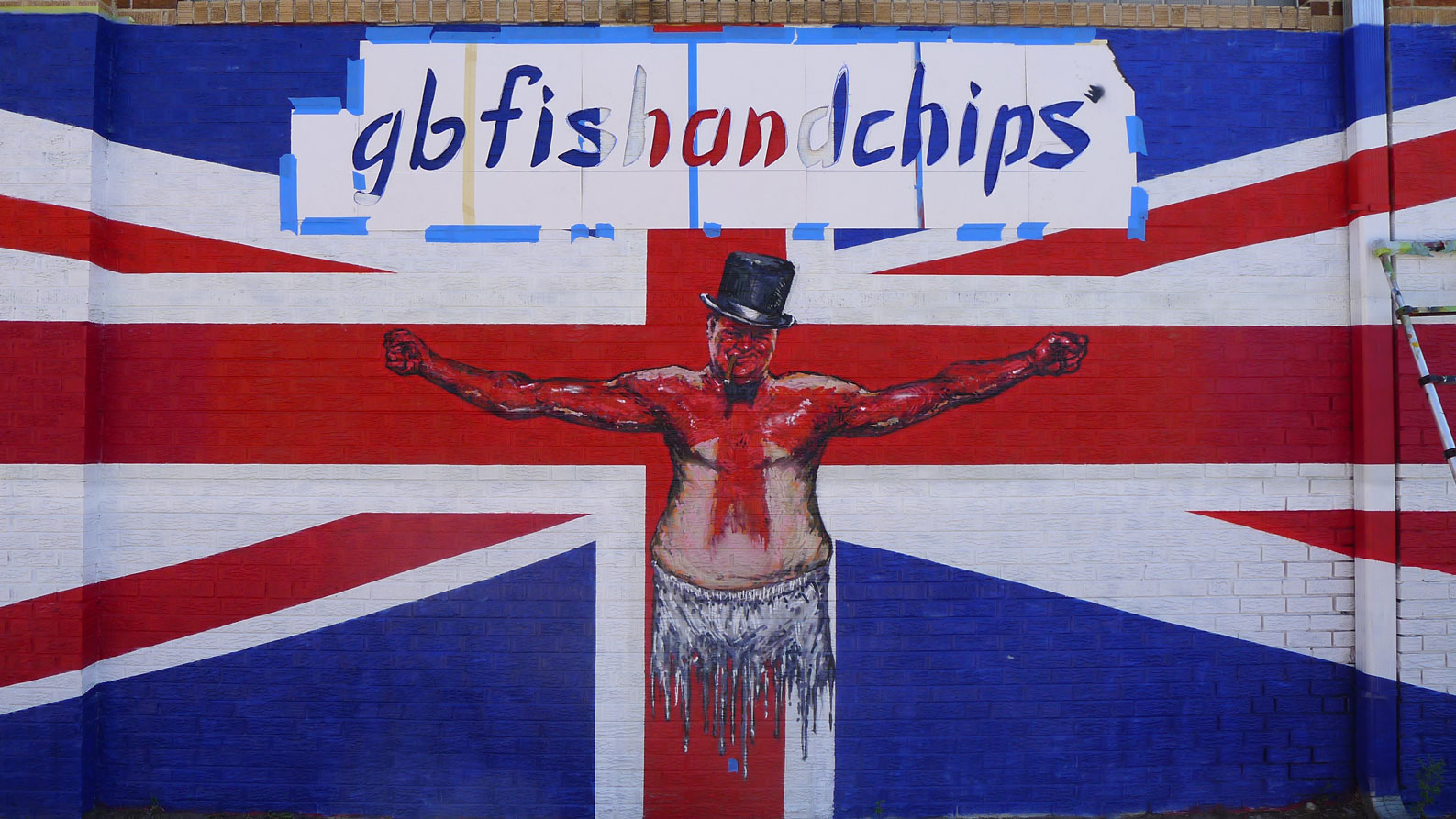 The figures are in their final stages (shots above are early morning to show full detail range), and as I prep to finalize all three at once with small touches, I have been readying the letters to complete the mural. Here are step by step process photos of how I arrived at getting these letters level, spaced correctly, and shaped to apply them as seen in the samples. First I projected the lettering, roughed in a pencil version, went over this with a prismacolor layer, then hand cut them. There is a level line applied to the stencil, and this is how it is measured on site. The black outline is then applied by hand with a skinny pro on black spraypaint. We chose the yellow lettering to better match the existing GB'S logo. Stay tuned for the completed mural shots and detail shots of the entire work. Thanks for viewing.